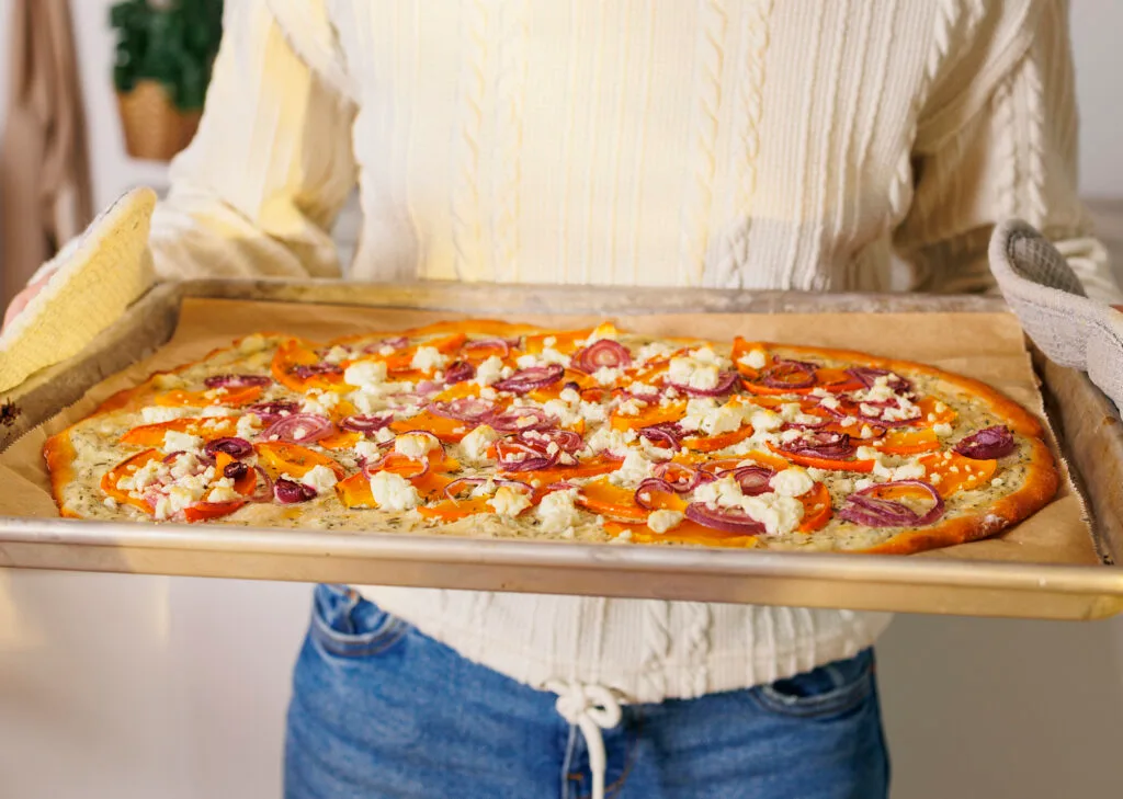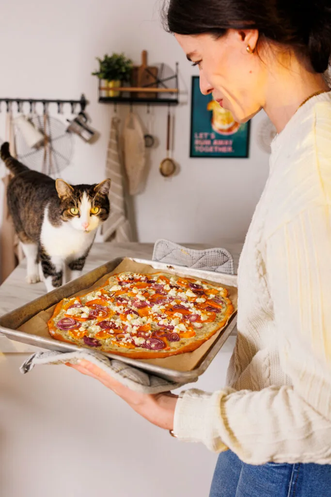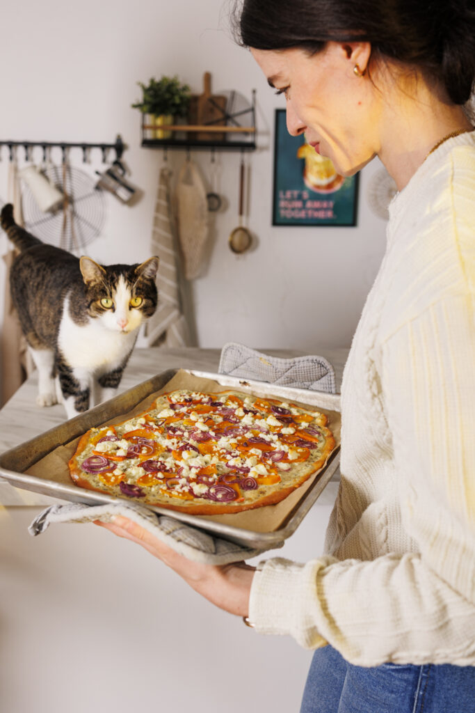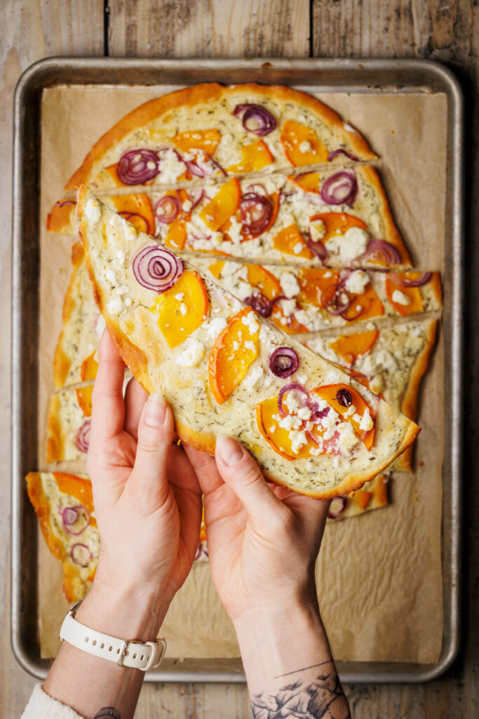 - Kürbis-Protein-Flammkuchen aus dem Ofen nehmen, in Stücke schneiden und servieren.