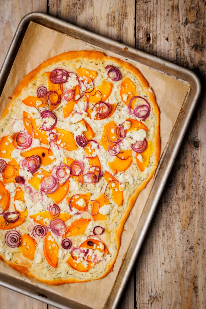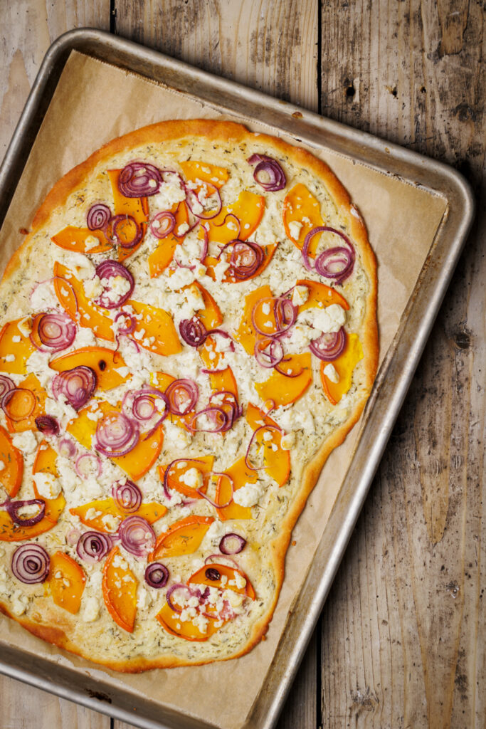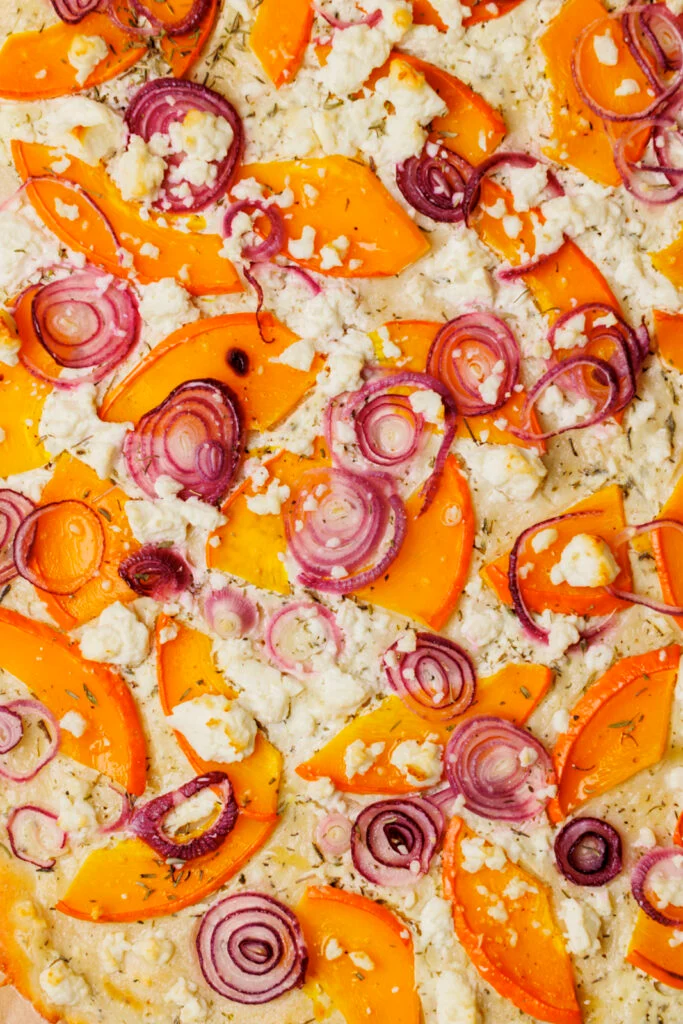 - Kürbis und Zwiebel auf dem Sauerrahm verteilen und mit Feta bestreuen.